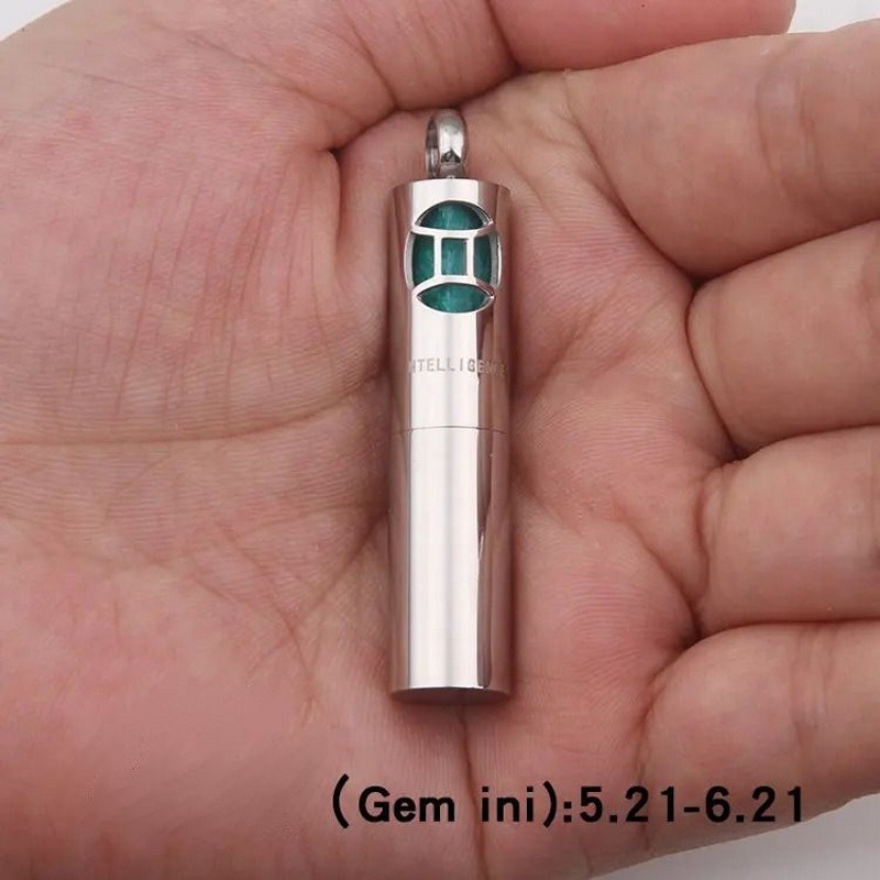 Magas minőségű (316l, élelmiszer biztonságú), rozsdamentes nemes acél aroma tároló és párologtató szelence, rajta horoszkóp szimbólum kivágás, nemes acél lánccal.