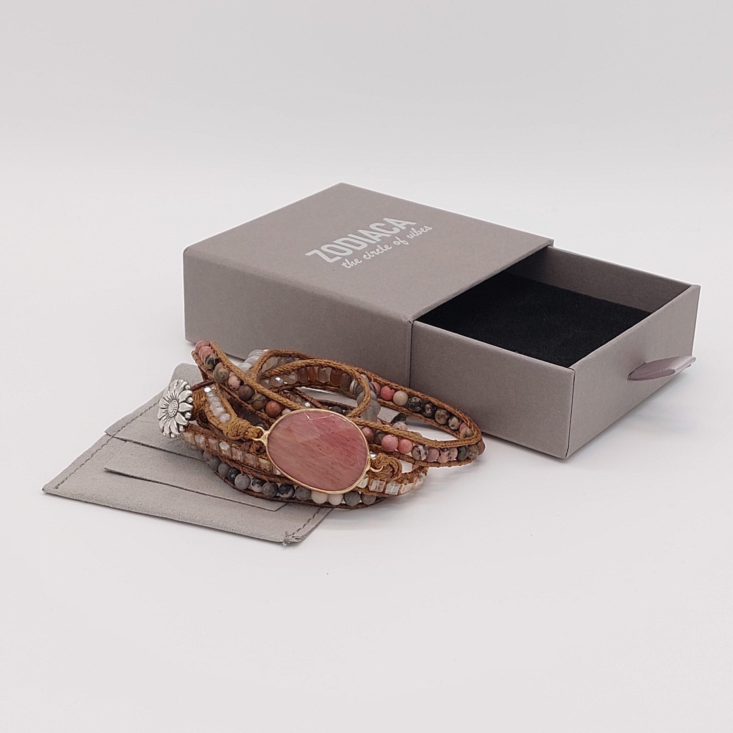 Középen egy nagyobb vöröses-rózsaszín jáspis kő található, a gyöngyök rodonit, rózsaszín zebra jáspis, hematit, és kristályüveg gyöngyök.